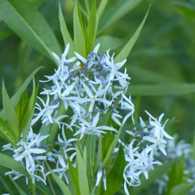 De Amsonia met het smalste blad, bijna draadvormig. Deze soort wordt veel gebruikt in zogn. prairietuinen vanwege haar betrouwbaarheid en haar bijzondere silhouet. In het najaar kleurt het blad geel waardoor het lang een interessante plant blijft. De bloei is zoals alle Amsonia’s blauw, in de voorzomer.