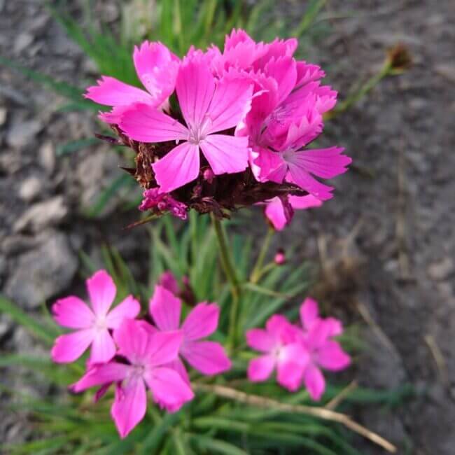 Karthuizer Anjer. Komt hier en daar nog in het wild voor. Kleine pollen grasachtig blad en kleine, felgekleurde bloemen. Niet erg standvastig maar leuk in een losse beplanting of bloemenweide.