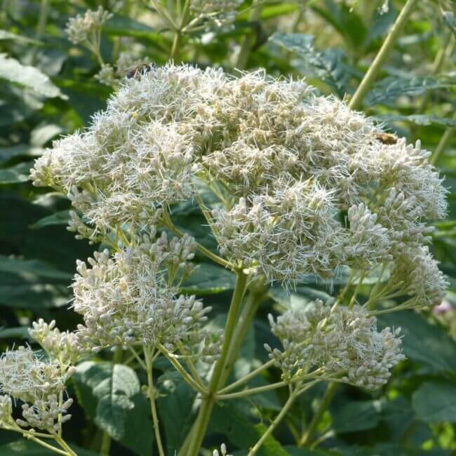 Schitterende Eupatorium; goed gezond en stevig en met grote zuiverwitte schermen. Zoek een mooie plek en laat hem daar een paar jaar staan, hij wordt alleen maar mooier.