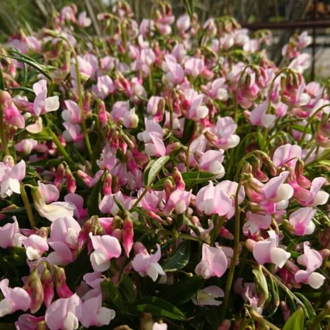 Vroegbloeiende vaste plant (klimt niet!) die nette pollen vormt met fel rose-witte bloemen.