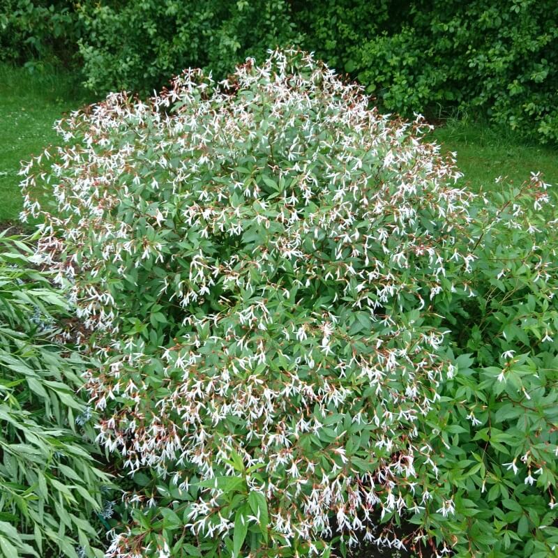 Mooie bossige plant met heel veel witte bloemen die uit donkerrose knoppen groeien. Niet te droog. Groeit niet snel maar wordt ieder jaar een beetje groter en mooier.