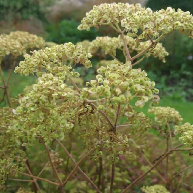 Schermbloem die niet helemaal wit bloeit, eerder een soort bleekgeel. De stelen zijn mooi donker.